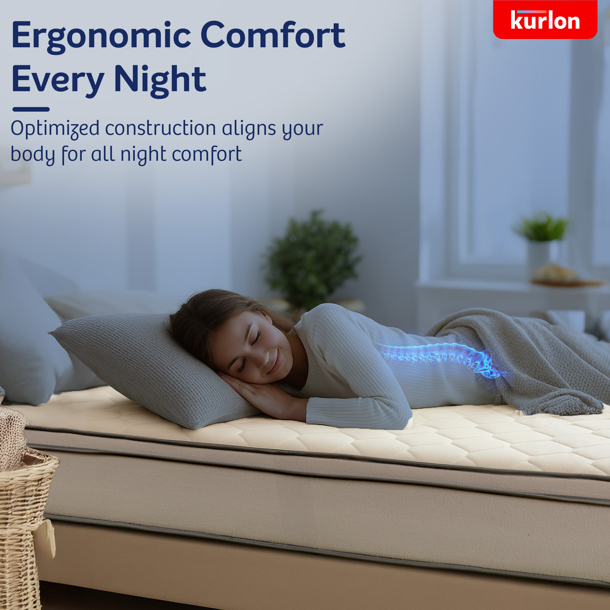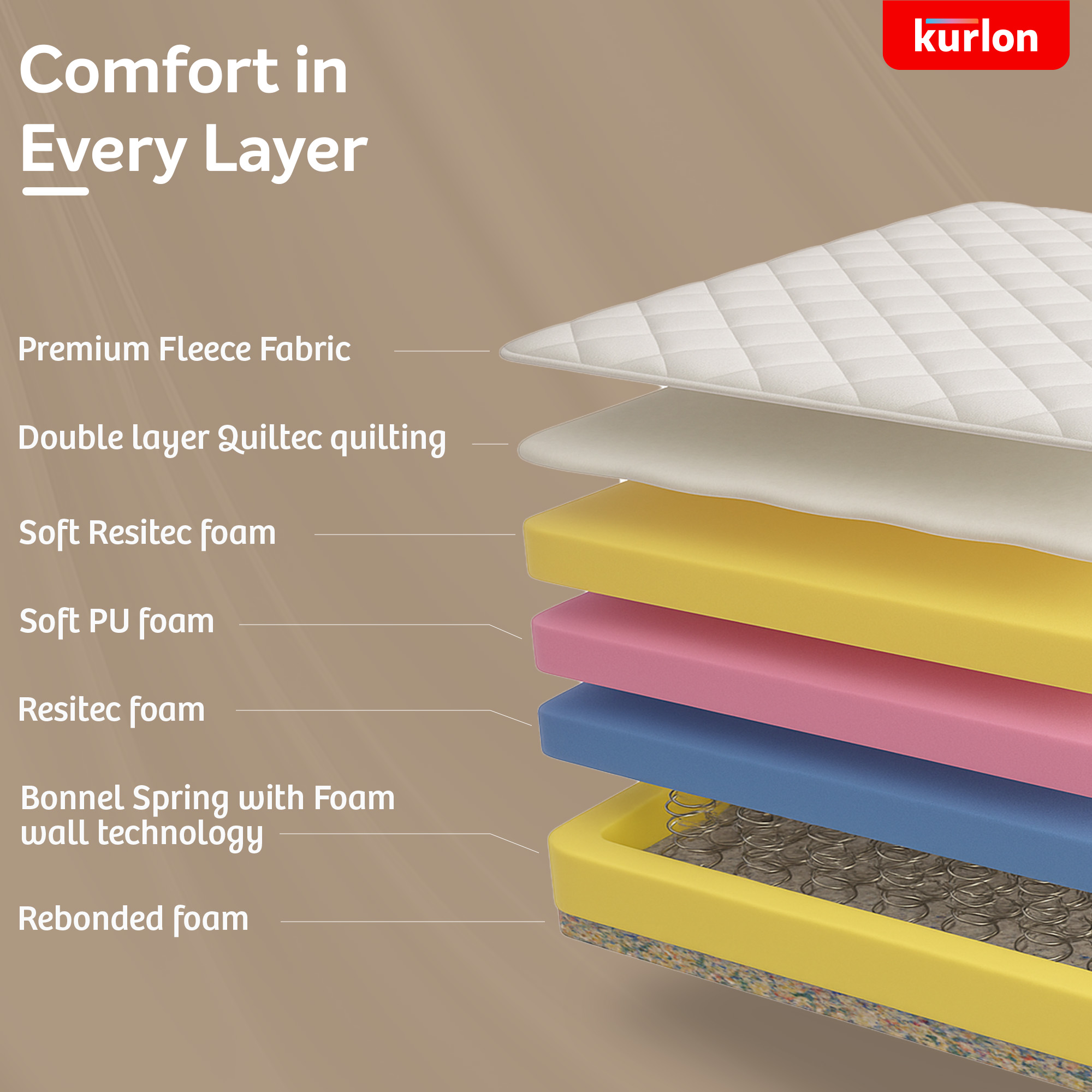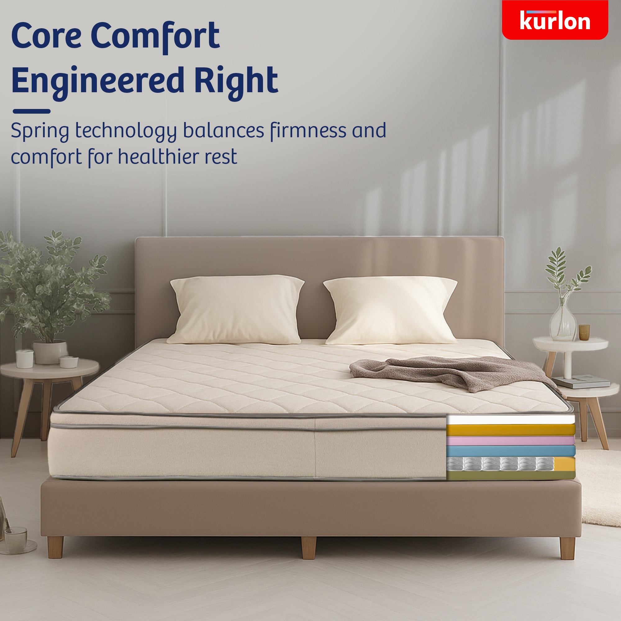 For added comfort, the mattress features a double layer of Kurlon Quiltec® foam, delivering a plush surface feel without compromising the mattress’s medium-firm orthopedic support. Paired with Resitec (HR) foam, it ensures ideal posture alignment—neither too hard nor too soft—allowing for uninterrupted, restorative sleep.