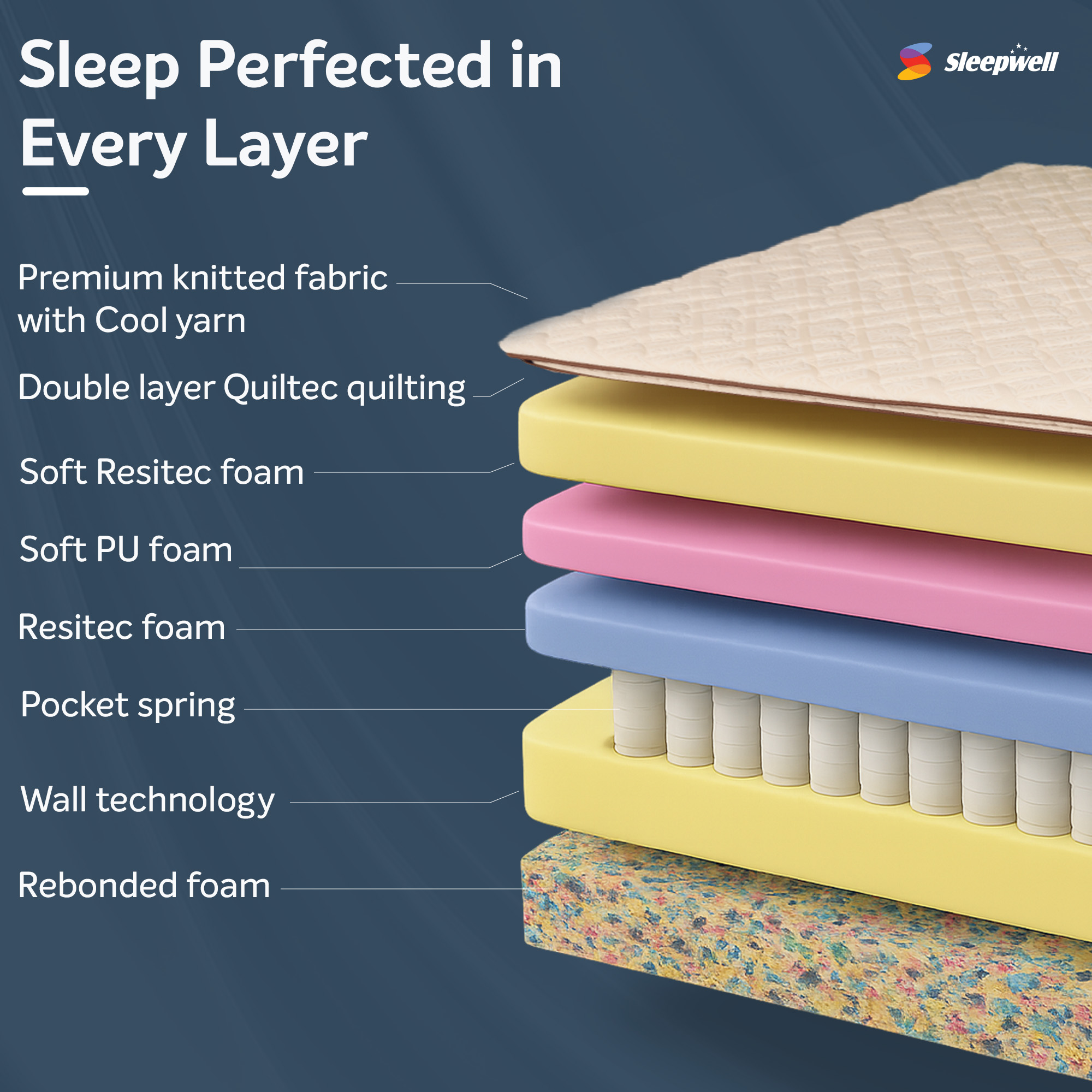 Experience elevated sleep with the Sleepwell Executive Pocket Spring Mattress, crafted with soft Resitec® foam, advanced pocket spring technology, and Neem Fresche® protection. Designed for superior orthopedic support and long-lasting comfort, it adapts to your body while ensuring a fresh, hygienic sleep—backed by a 10 Nights Trial for complete peace of mind.